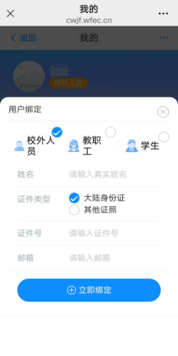 2、关注后,选择“缴费入口”→“统缴平台”,在弹出的新页面中,点击“校外人员”,输入“姓名、证件号 (填写身份证号) ”,点击“立即绑定”按钮。绑定成功后回到首页。