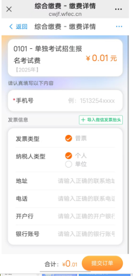 4、点击缴费项目,在弹出的界面中输入“手机号”(必填项,),缴费金额:70.00元,点击“提交订单”,点击“微信支付”即可。